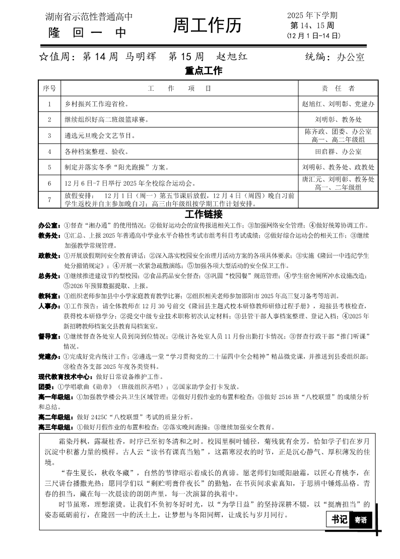 隆回一中2025年下学期第14、15周工作历