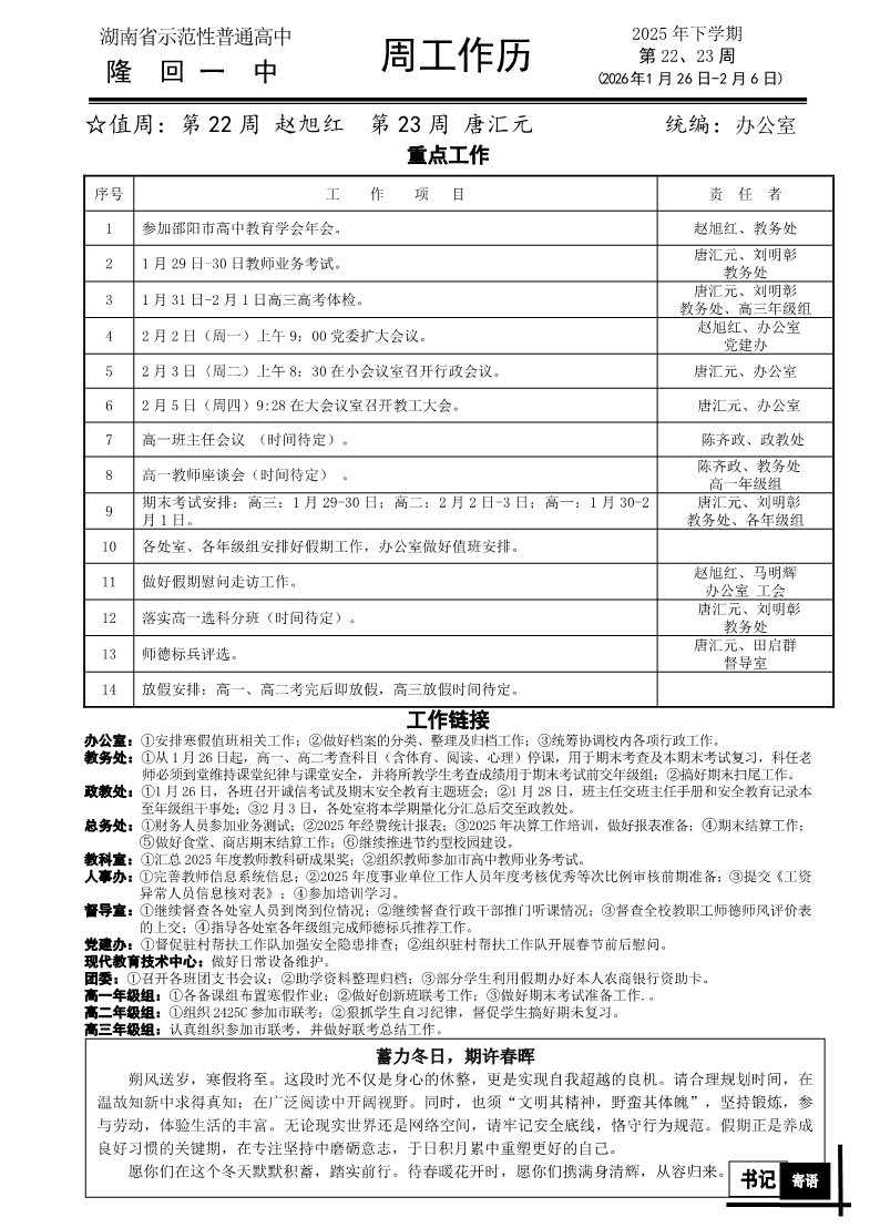 隆回一中2025年下学期第22-23周工作历