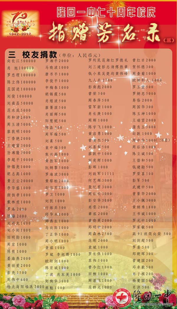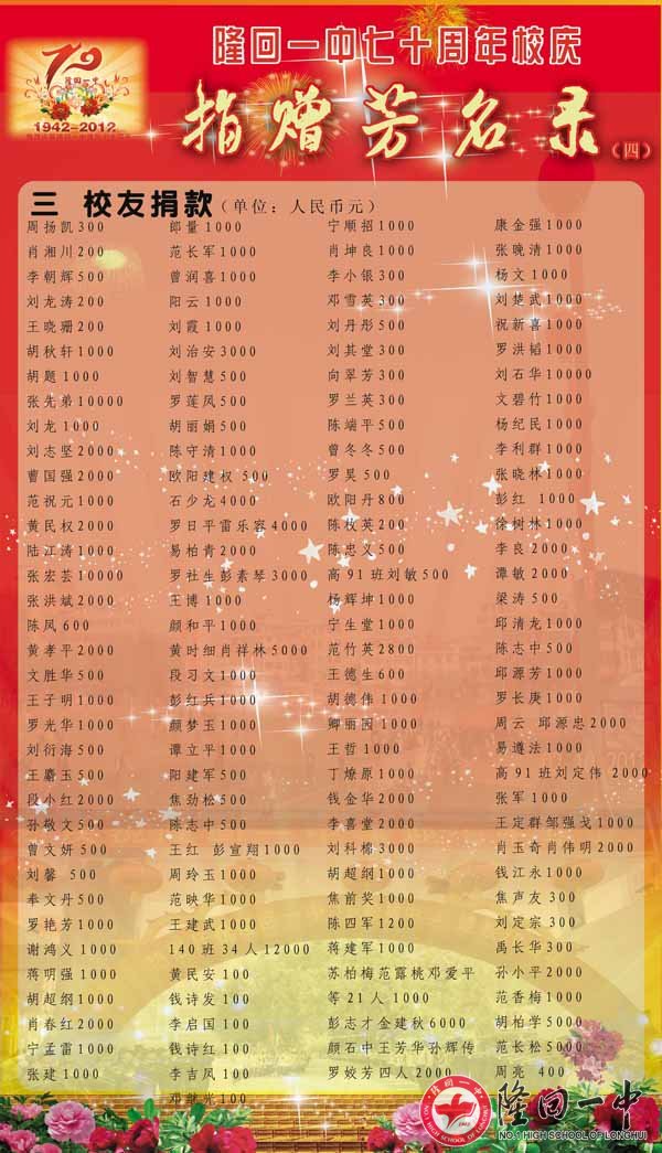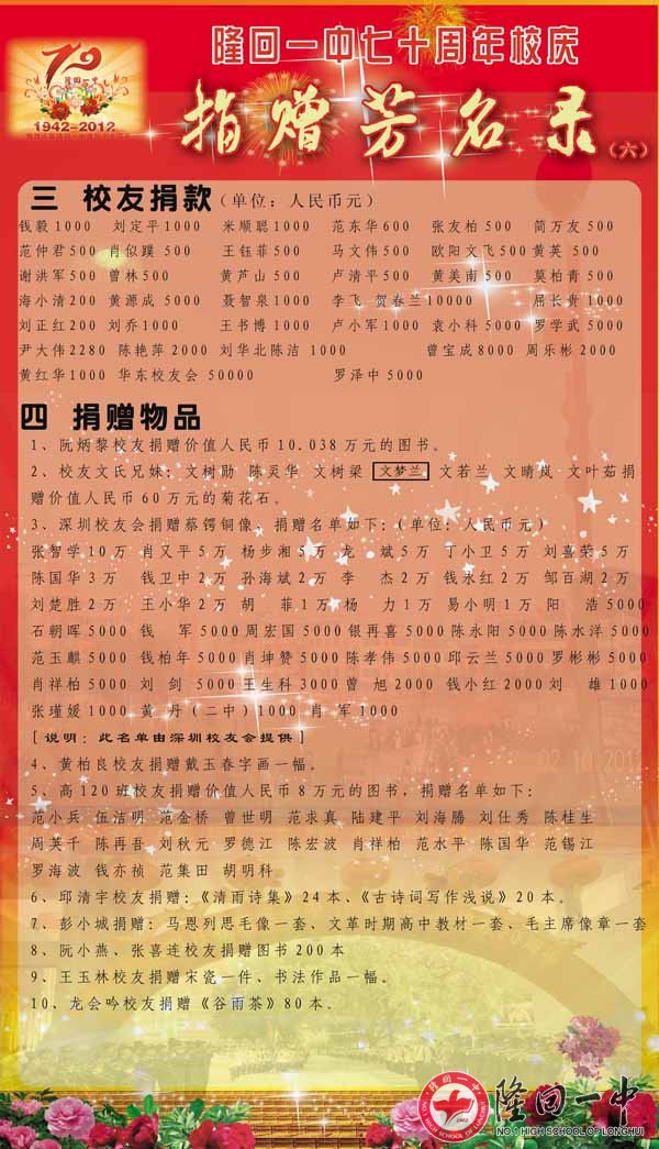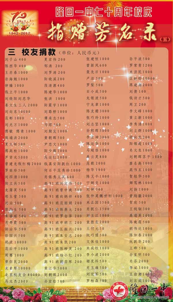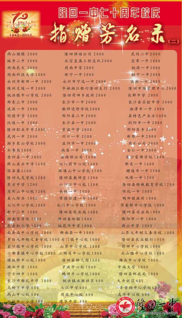 隆回一中70周年校庆捐赠芳名录 来源:本站 发布时间:2014-02-23 16:20:57 浏览次数: 次 【字体:小 大】 因为捐赠的核对才完成,所以延误了公布,请校友原谅。如果有不准确的地方,请联系QQ:120054788。 智能标签: 隆回 一中 周年校庆 捐赠 名录 相关内容 分享到: 【打印正文】