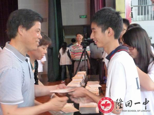 毕业典礼进行到最高潮,校长、书记一一给同学们颁发毕业证。此时,《相逢是首歌》歌曲响起,两侧电子屏幕上打出班级毕业照和毕业生姓名,大屏幕上播放着2013届学生在校学习生活等专题视频,同学们依次排队上台领取毕业证,接受校长、书记和班主任、老师的祝福,并相互拥抱,激动的泪水不时从大家的眼眶流出,场面感人至深。
