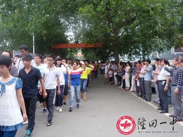 8时58分,学校广播《相逢是首歌》悠扬响起,礼炮齐鸣。毕业同学以班为单位,在曾经苦读的闻达楼前,排着整齐的队伍,依次告别母校,离开校园。学校领导、老师和高二、高一部分同学分列校园大道路两边,夹道欢送,与离校同学挥手告别。