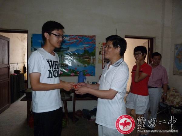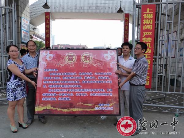 目前,2013年高考本科录取工作基本结束,隆回一中唐静娴、马凌宇2名同学高兴地收到了清华、北大的录取通知书。8月2日,隆回一中校领导陈惟凡、陈华堂、周跃南、阳自田、周后秋和高三年级部、教务处、办公室负责同志及两位学子班主任分别到唐静娴、马凌宇同学家和他们的初中毕业学校桃花坪中学送去喜报和奖金。