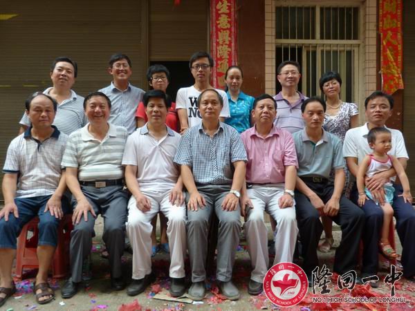 图1:校长陈惟凡(右二)、书记陈华堂(左二)给桃中送喜报